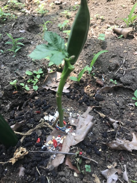 2019年May月27日 夏野菜 植込 朝見たら、つるむらさきの苗がまたネキリムシに1本やられていたので、すべての苗(つるむらさき、オクラ、モロヘイヤ)にストロー、唐辛子、卵のカラの3点対策セットを施してみた。今度は無事育ってくれるといいんだけど。 犯人のネキリムシは、腹が立ったので土を掘り返すと丸々と太って横たわっていたので、スコップで叩き潰してやった。 ついでにオクラにもネキリムシ対策